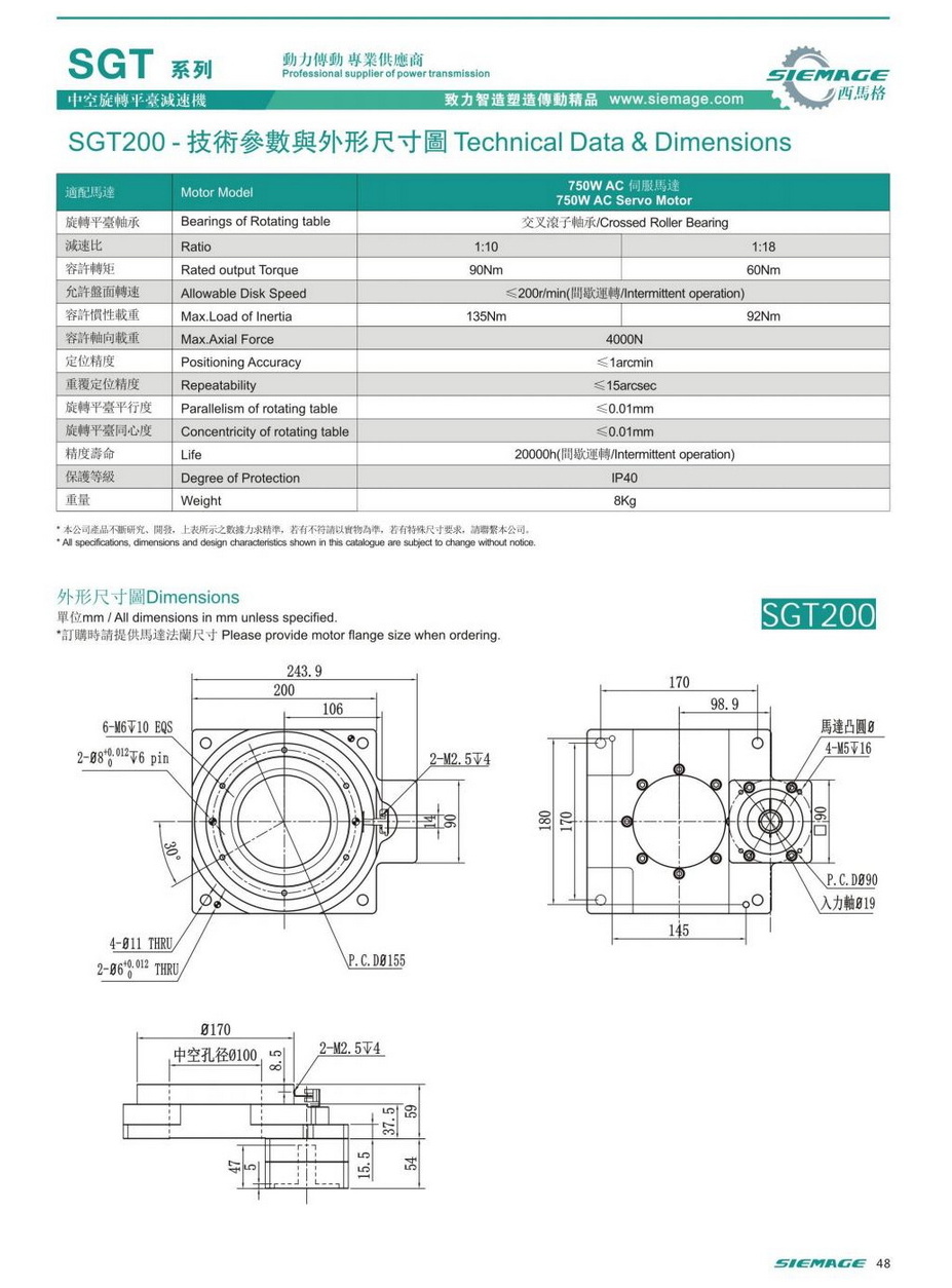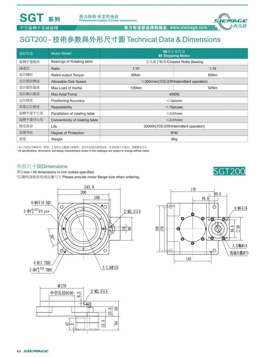 中空旋轉(zhuǎn)平臺(tái)減速機(jī)SGT200,siemage中空平臺(tái)可配各品牌750W伺服電機(jī),伺服馬達(dá),各廠家86型步進(jìn)馬達(dá),86步進(jìn)電機(jī)。減速比有1:10,1:18等。
