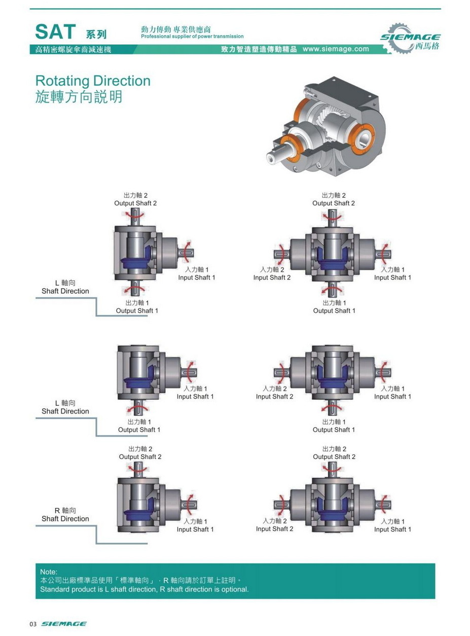 西馬格螺旋傘齒輪減速形式有SAT-FO,SAT-FN,SAT-FM,SAT-FV,SAT-FP,SAT-RO,SAT-DO,SAT-YO,SAT-RN,SAT-RM,SAT-RS,SAT-RV,SAT-RP,SAT-DN,SAT-DM,SAT-DV,SAT-YS,SAT=YV等24種之種,滿足各裝安裝需求。