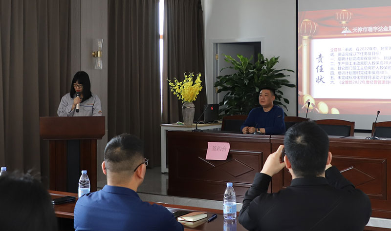 為確保公司發(fā)展戰(zhàn)略有效落實(shí),全面實(shí)現(xiàn)公司2022年度各部門工作目標(biāo),強(qiáng)化企業(yè)執(zhí)行力,提升核心競爭力。2月20日,天津市瑞豐達(dá)金屬制品有限公司目標(biāo)責(zé)任狀簽約儀式隆重舉行。總經(jīng)理張加軍、CEO王娟、各部門負(fù)責(zé)人、中高層管理人員等出席此次會議。