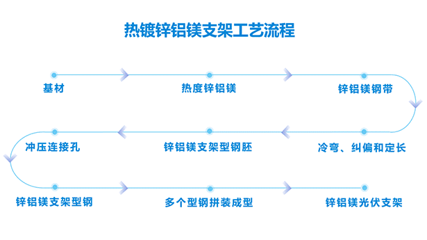 新型鍍鋅鋁鎂光伏支架生產工藝環保、成本低、壽命更長、擁有超強耐蝕性和切割斷面的自我愈合功效,在光伏支架行業表現突出。隨著市場要求的日趨嚴格,這種材質支架早已成為光伏支架市場中的一大主流產品。