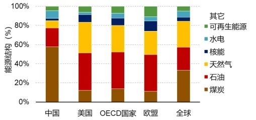 與全球主要經(jīng)濟體相比,我國重工業(yè)比重偏高,能源結(jié)構(gòu)以煤為主,在新能源利用方面,還有很大的上升空間。