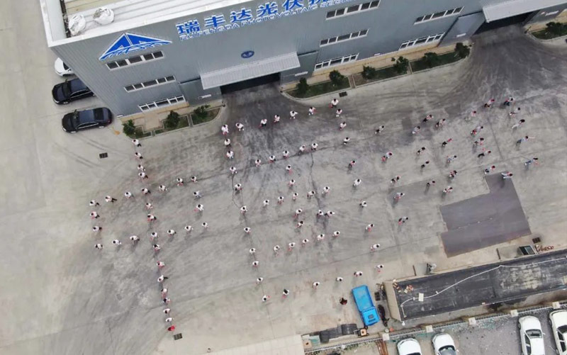 活動第一部分,全體員工在廠區(qū)門口空地上擺出”中國100“字樣,畫面十分氣派。