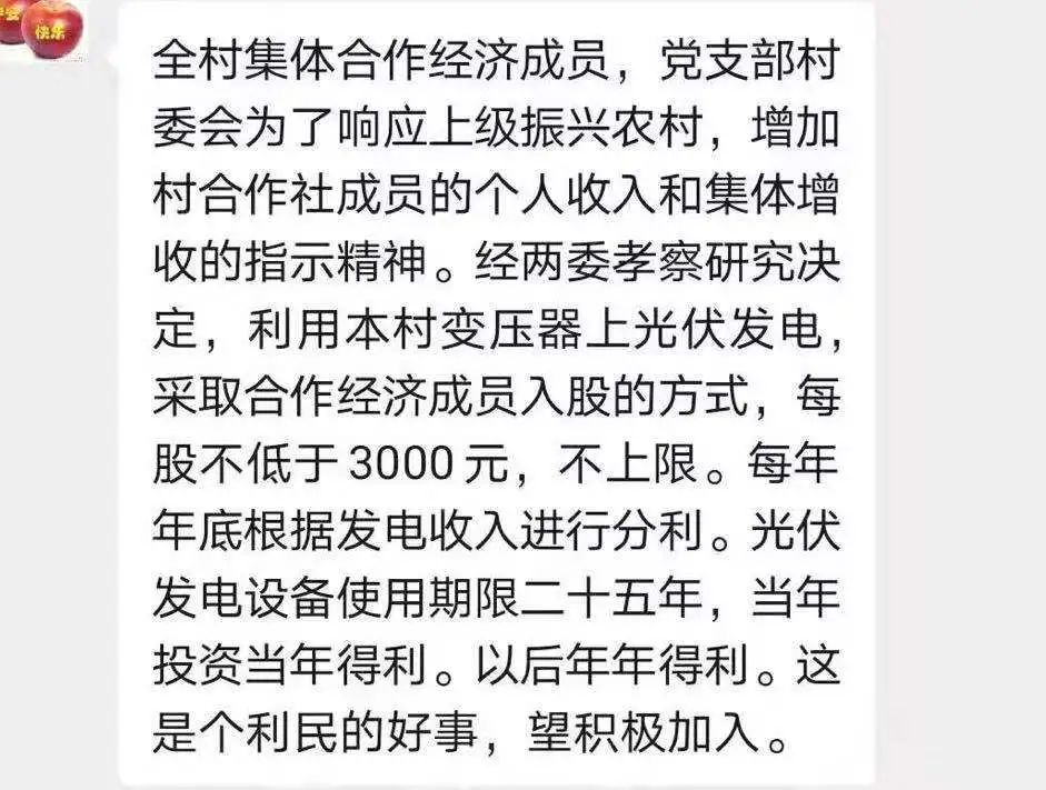 最近,有朋友發了一張圖,說他們村開始通知村民集資建光伏電站了,然后年底進行分紅。一時間來,老百姓的投資意識又提高了,開始集資建光伏電站了。
