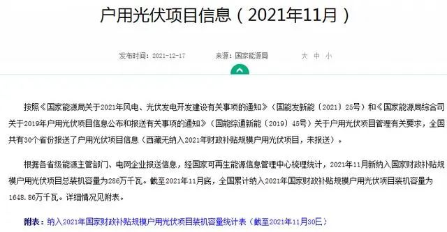 根據國家能源局統計數據,截止到2021年11月30日,全國僅2021年納入國家財政補貼的戶用光伏就已經達到了1648萬千瓦,遠遠超出今年的戶用光伏補貼指標。如果算上最后一個月份的話,最少也在1800萬千瓦以上。今年一年的全國的安裝戶數,預計在100萬戶以上。